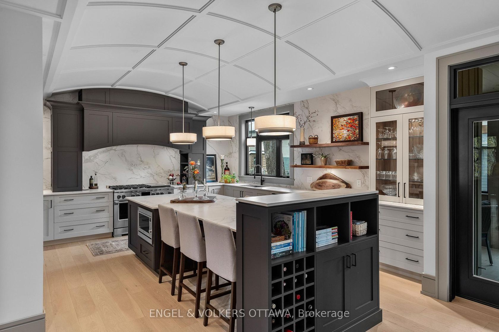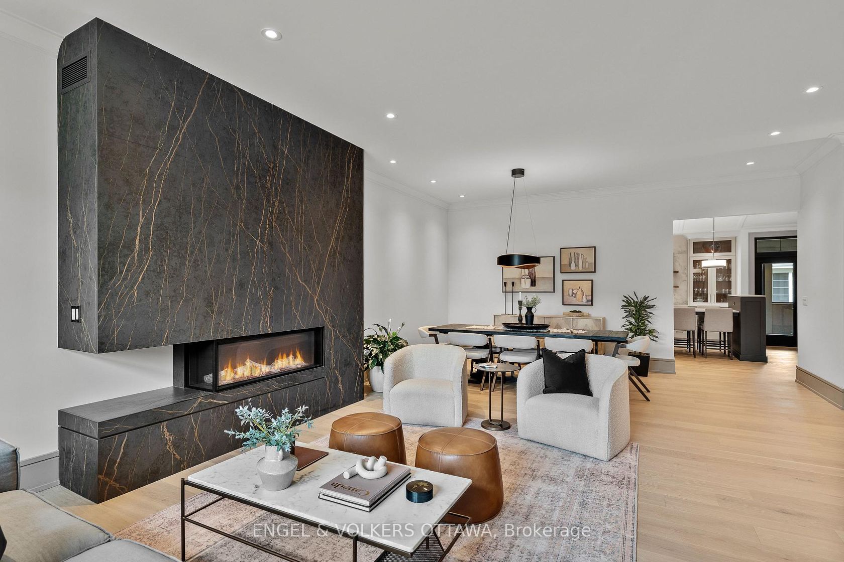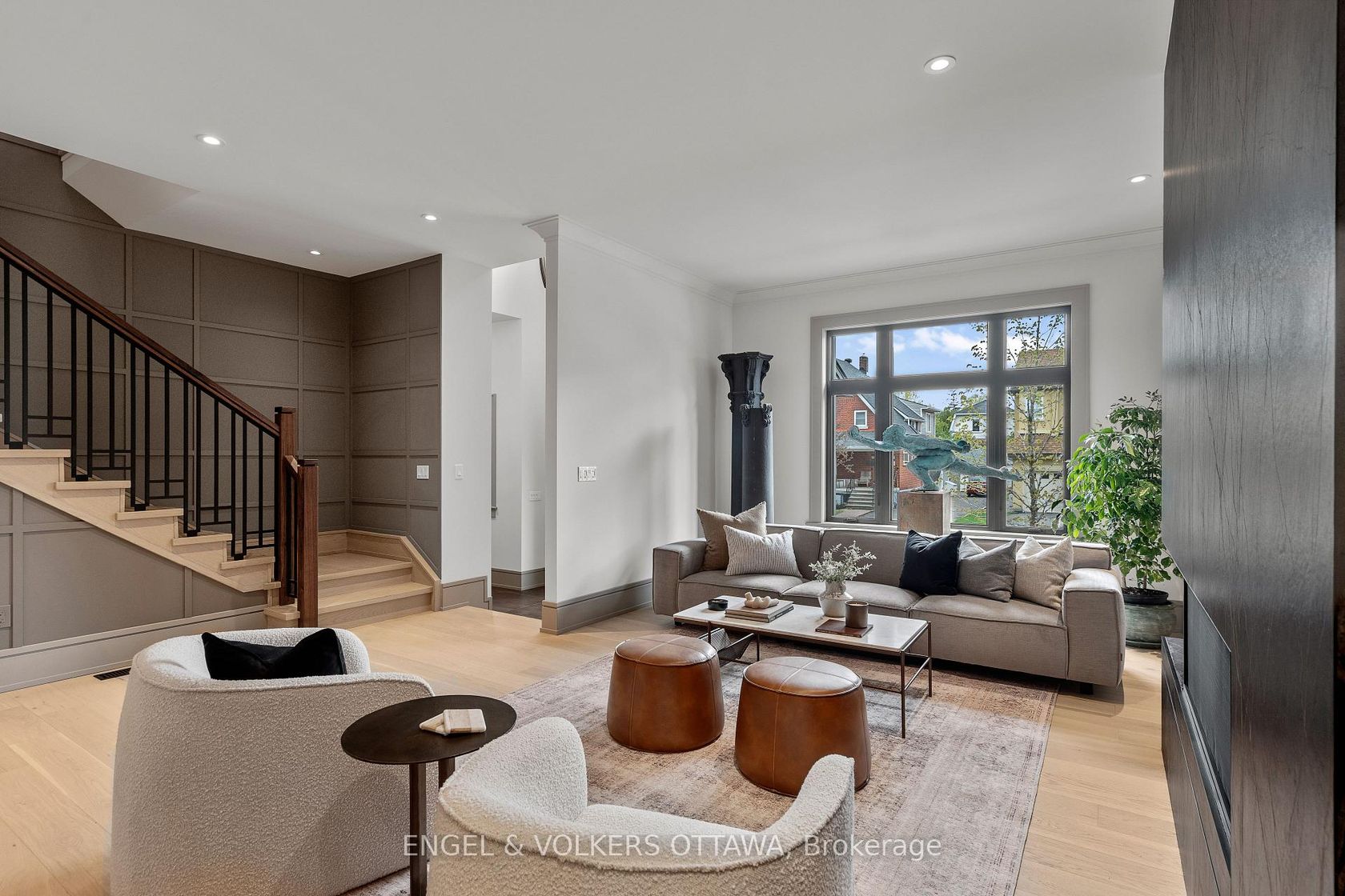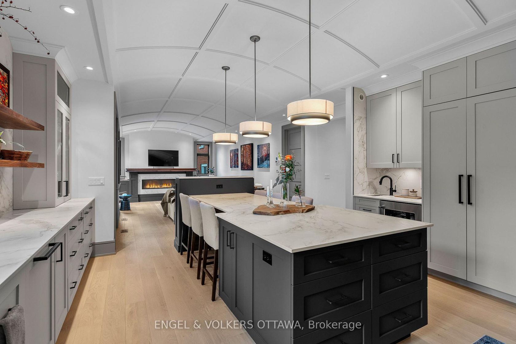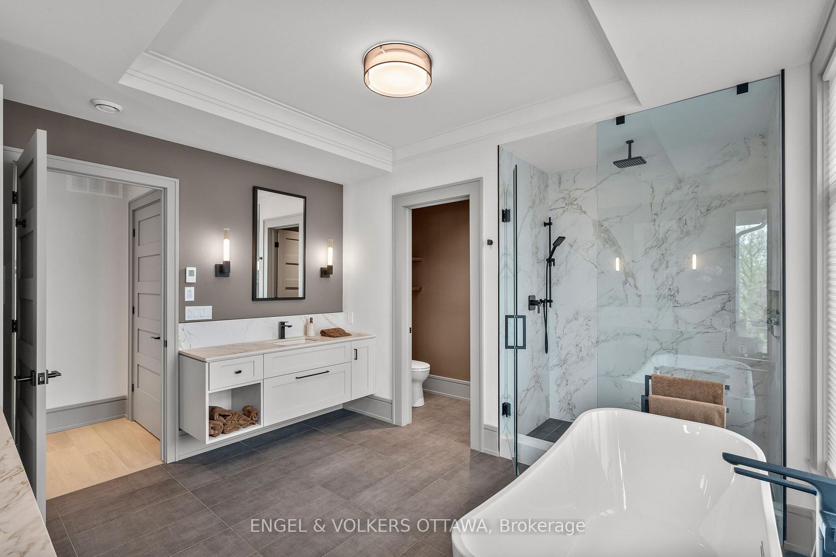 This high-quality, 3,500 sq. ft. custom home in the heart of Wellington Village is not only beautiful, the layout is functionally fabulous and features a rare double-height garage w/ reinforced floors, zoned HVAC and elevated ceiling heights. The entry is anchored by a dramatic 22 ft high foyer w/ custom walnut niche, walnut light fixtures, and heated porcelain floors that lead to an adjacent mudroom or the open-concept living & dining area featuring a floor-to-10-foot-ceiling-height fireplace clad in Dekton porcelain slabs & a custom staircase featuring walnut handrails and newel posts milled from a tree once on the property. At the heart of the home, a chef-inspired kitchen boasts a barrel-vaulted ceiling that extends thru to the connected family room, Dekton countertops & walls, 10 ft island, a beverage station & premium Fisher & Paykel appliances and an adjacent screened porch. Arriving at the second level, you're met w/ a 2nd barrel-vaulted ceiling, 9 ft high and four spacious bedrooms all with ensuite bathrooms & a nursery/office. The primary suite features his & hers walk-in closets & an ensuite w/ Dekton counters & shower surround, wood-accent shelving as with other bathrooms, & a free-standing tub. A well-appointed laundry room with a proper sink, quartz counters & ample storage. The lower level provides bonus living space w/ a sprawling recreation room w/ rough-in for a bar, a bedroom w/ an ensuite, a powder room, & heated flooring throughout. 8'-4" ceilings, w/ pot lighting & LVP wide-plank floors maintain the character of the home's upper levels. The remainder of flooring throughout the home is wide-plank, white oak engineered hardwood. The landscaped, fully fenced backyard includes an interlock patio, a cedar pergola-topped BBQ deck, defined garden beds & mature trees. Set on a tree-lined street in Wellington Village, this home is just steps from Elmdale Public School, Parkdale Market, and the shops, cafés, & restaurants of Wellington West & Westboro.